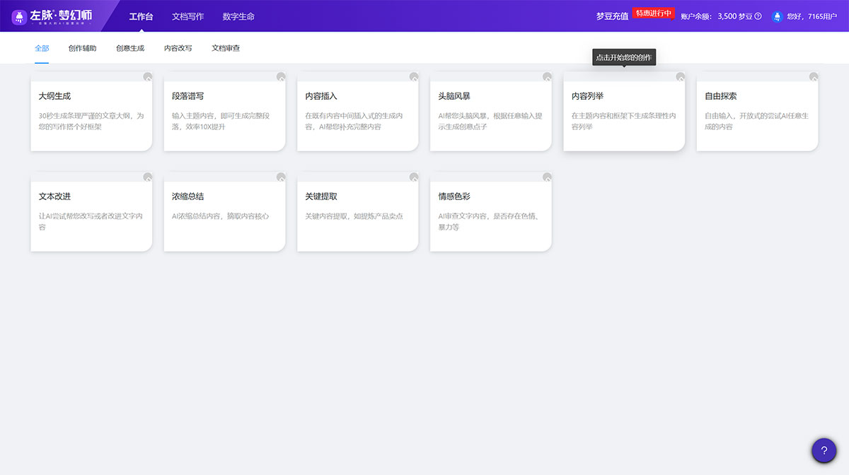 对于自媒体人而言,左脉?梦幻师可以助你更好的进行创作,提高自媒体创作效率和质量,解决自媒体新手文案写作困难、没有灵感等棘手问题!文本内容生成是梦幻师的核心功能,您只需输入一些文本作为提示,AI自动返回一个文本补全,尝试匹配您提供的主题或上下文。