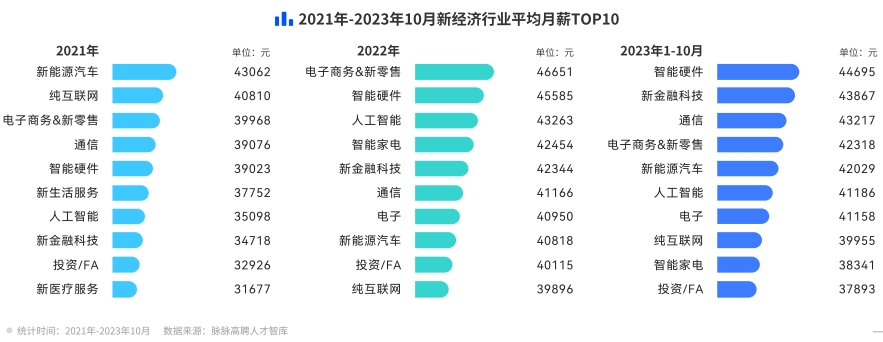 2023年1-10月,新经济行业新发岗位量前三十的企业中,泛互联网业企业21家,依然是吸纳人才最多的赛道。此外,还有比亚迪、吉利、理想、蔚来、东风汽车5家新能源汽车企业。